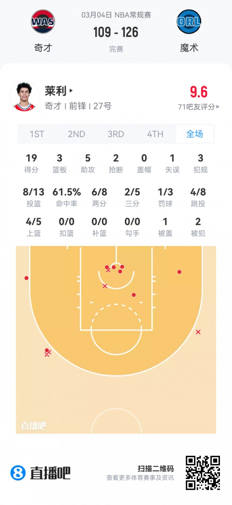 奇才首轮21号秀威尔·莱利 登场33.4分钟